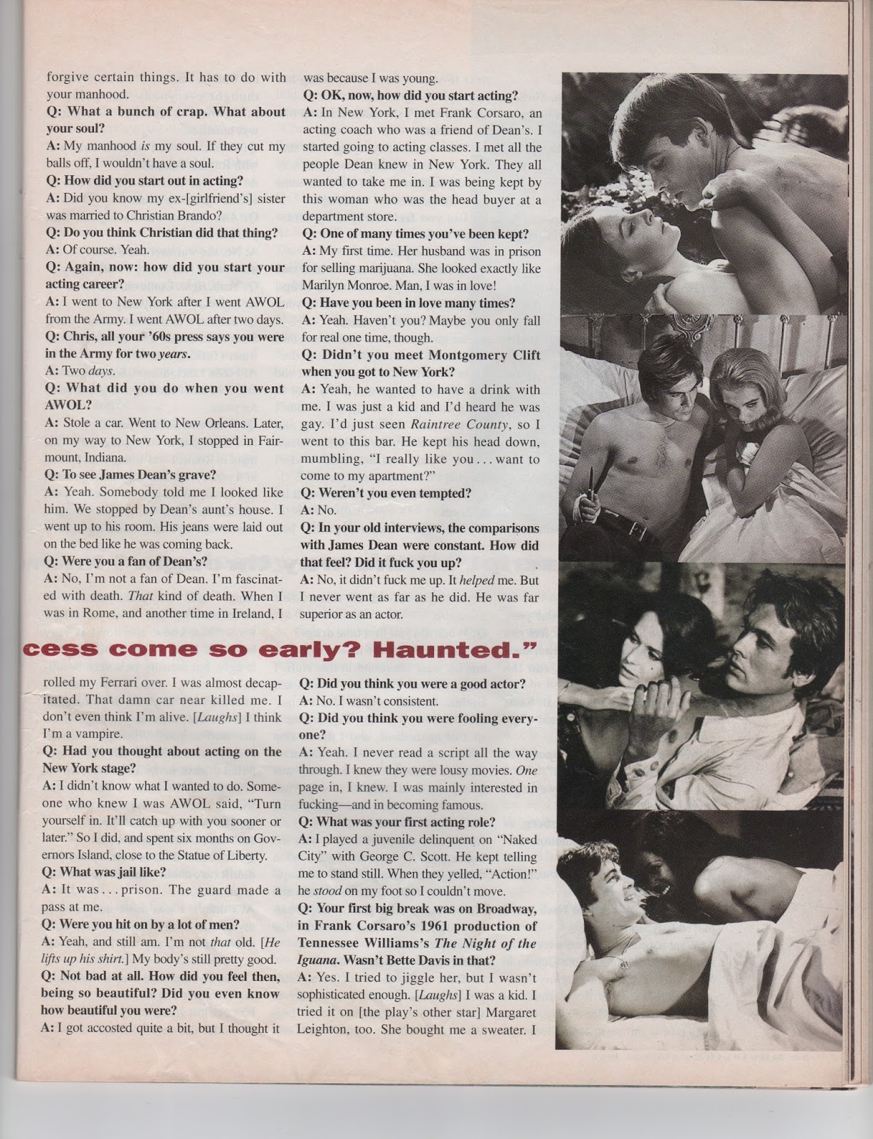 Chris joined the service as a young adult but went AWOL just two days later. After serving out his time on Governor's Island for this infraction, he moved to New York and studied painting, meeting a motley crew of actors and artists. Friends were startled by his moody nature and uncanny resemblance to the troubled Dean and he was encouraged to audition for the Actors Studio. He was accepted and eventually won the Broadway role of Pancho in "The Night of the Iguana" in 1961. Chris wound up marrying acting coach Lee Strasberg's daughter, Susan Strasberg, in 1965, but his erratic behavior would send her packing after three years and two children.