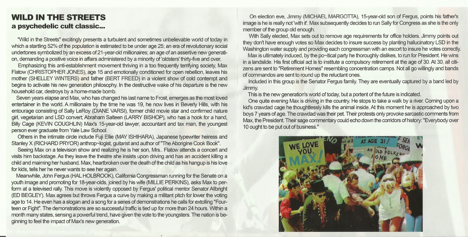 Jones' next film, Wild in the Streets (1968), made him a cult icon and should have been his springboard to superstardom. A B-movie that was meant to spoof the idea of "The Generation Gap", the film was taken straight by Baby Boomer audiences when it was released in 1968 and became a huge hit. More than The Graduate (1967) or Bonnie and Clyde (1967), this was the movie that signaled the Youth Revolution of the 1960s was morphing into a true revolution, in culture if not on the streets.A seminal film of the 1960s decade, that spoke directly to the new generation, Wild in the Streets (1968) is about the establishment's nightmare in the wake of Bob Dylan and The Beatles: that a rock n' roll star would tap into the youth against and use their vast popularity for political ends. (The Nixon Administration was sufficiently worried about the political activities of John Lennon in the early 1970 decade, that it took steps to deport him.)In the movie, the rock star "Max Frost" (played by Christopher Jones) joins a movement to lower the voting age in California from the then-legal 21 to 14. He uses his popularity to elect a politician to the U.S. Senate and a former child movie star and rock band member to the U.S. House, where they were agitated, for lowering the voting age. After states begin lowering the voting age, a voting rights' march on Washington leads to the shooting of marchers. Radicalized by their deaths, Max enters the race for president. Responding to the Establishment's dirty tricks, Max, and his cronies lace Washington, D.C.'s water supply with L.S.D. in order to drug congressmen and blow their minds straight out of the box. In response to being turned on, Congress lowers the voting age to 14 and Max is elected President of the United States in a landslide due to the younger youths voting. Due to a climate of political violence targeted at the new regime, Frost assumes close-to-dictatorial powers and declares 30 to be the mandatory retirement age, after which citizens will be drugged on LSD. Violence sweeps the land as the fascists launch a counter-revolution, and at the end, children under 14 have begun to regard Frost and his generation as the enemy.