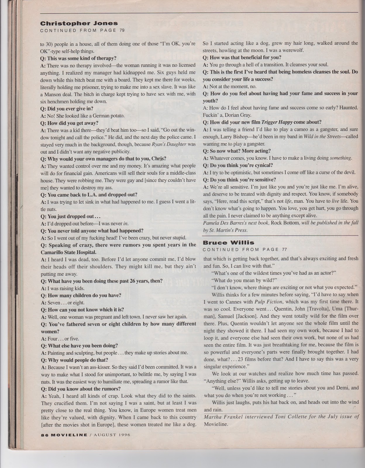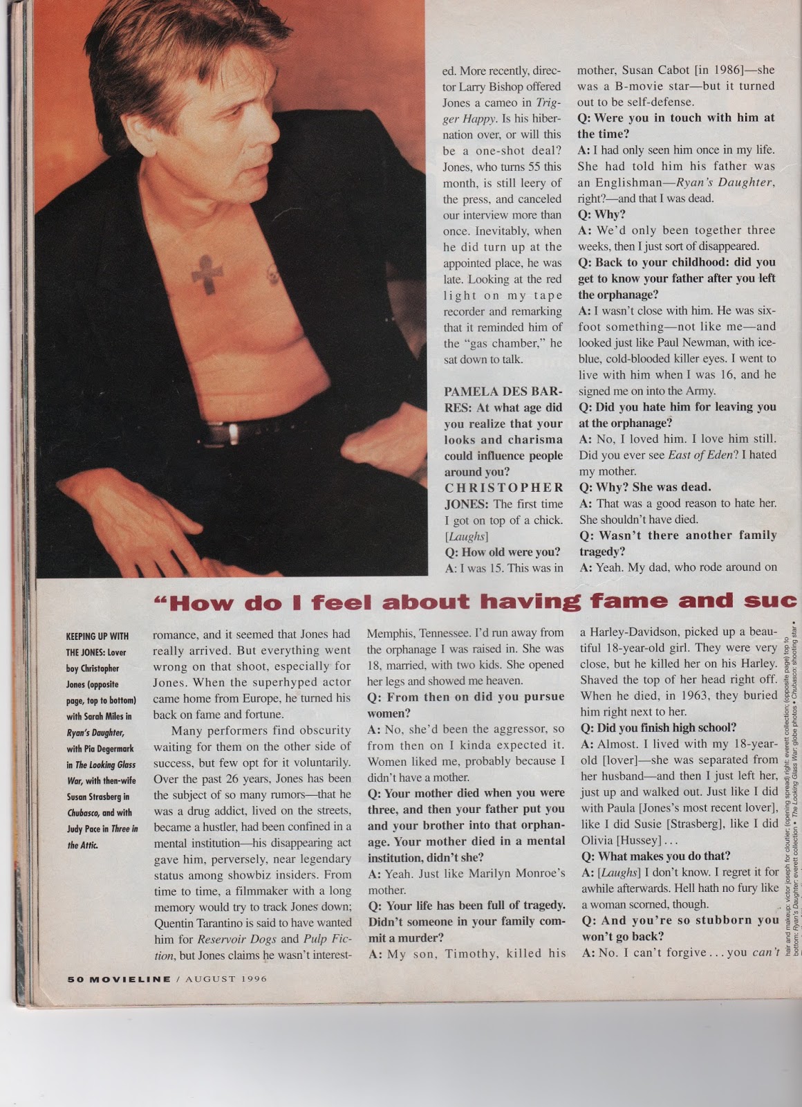 Producers kept trying to interest Jones in a comeback. In the early nineties, Quentin Tarantino became the latest filmmaker to seek Jones out, hoping to cast him in his follow-up to his first film, Reservoir Dogs (1992). He offered Jones the role of one of the pawnshop perverts in Pulp Fiction (1994), but Jones turned him down as he did not want to return to acting. Surprisingly, he did return to acting in 1996, accepting a small role in Mad Dog Time (1996), (after he retired in 1969, from results of friendly actress, Sharon Tates brutal death, on Saturday evening, August 9th, 1969, that Charles Mansons extremely diabolical cult members had pulled, which was written and directed by Larry Bishop, who had played the character role of "The Hook", in "Wild in the Streets." There are no signs that he plans to make another picture, or leave behind his painting for a second go at a career before the camera.